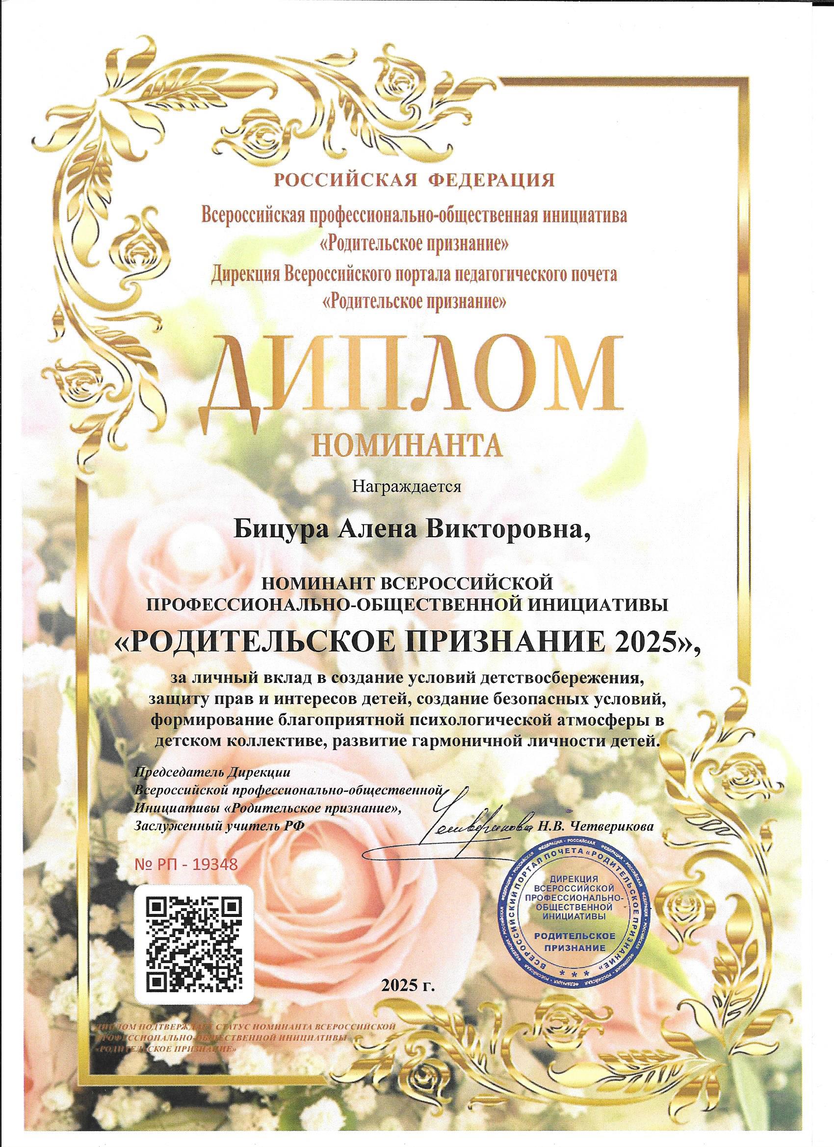 Диплом номинанта. МБДОУ Детский сад "Сказка". "Родительское признание -2024г.