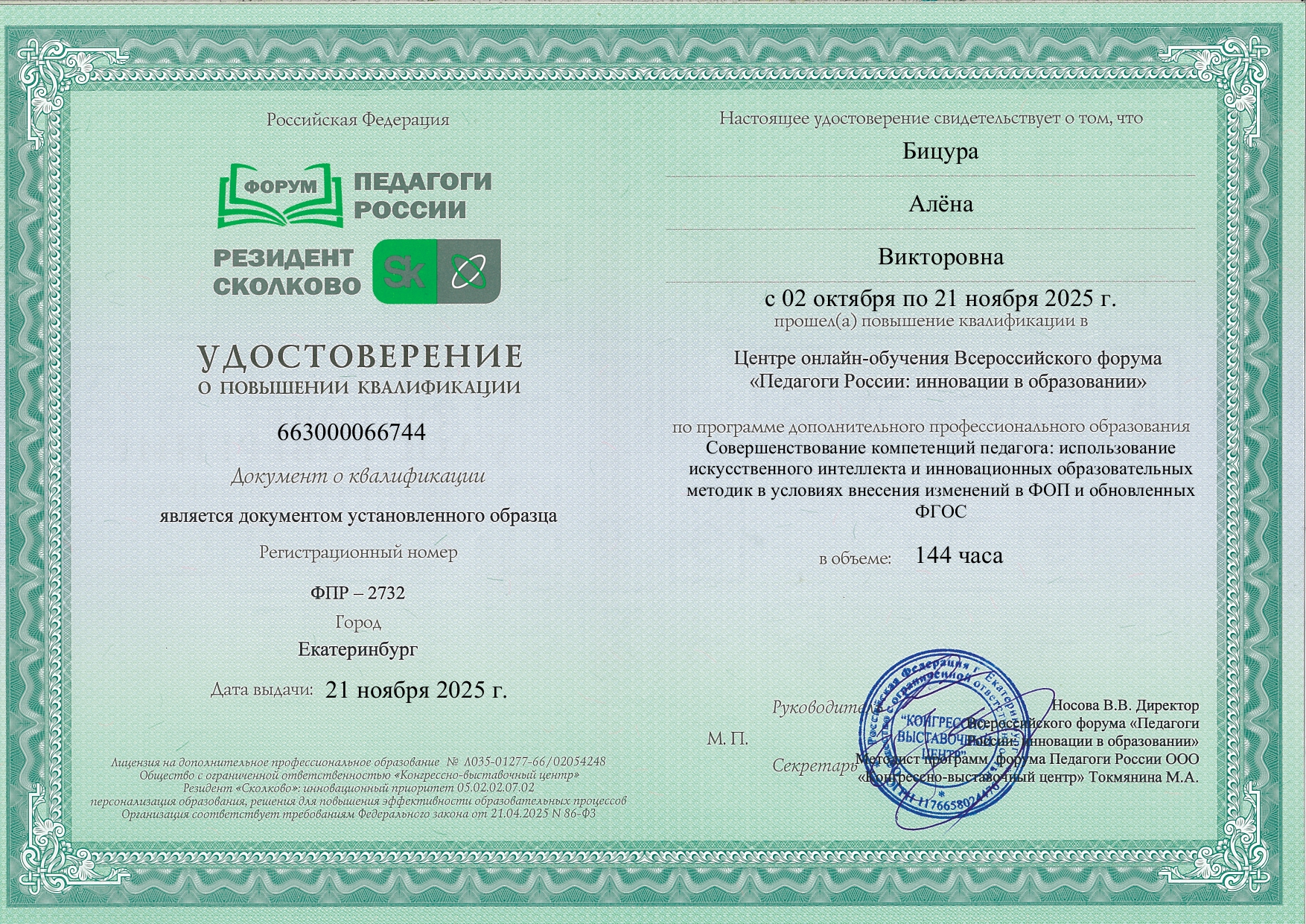 Удостоверение повышение квалификации. "Использование искусственного интеллекта и инновационных образовательных методик в условиях внесения изменений в ФОП и обновленных ФГОС