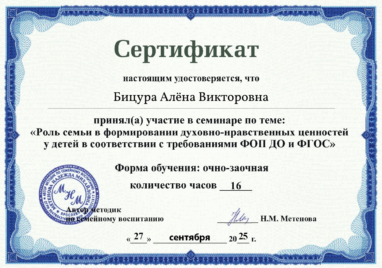 Сертификат "Роль семьи в формировании духовно-нравственных ценностей у детей в соответствии с требованиями ФОП ДО и ФРОС"
